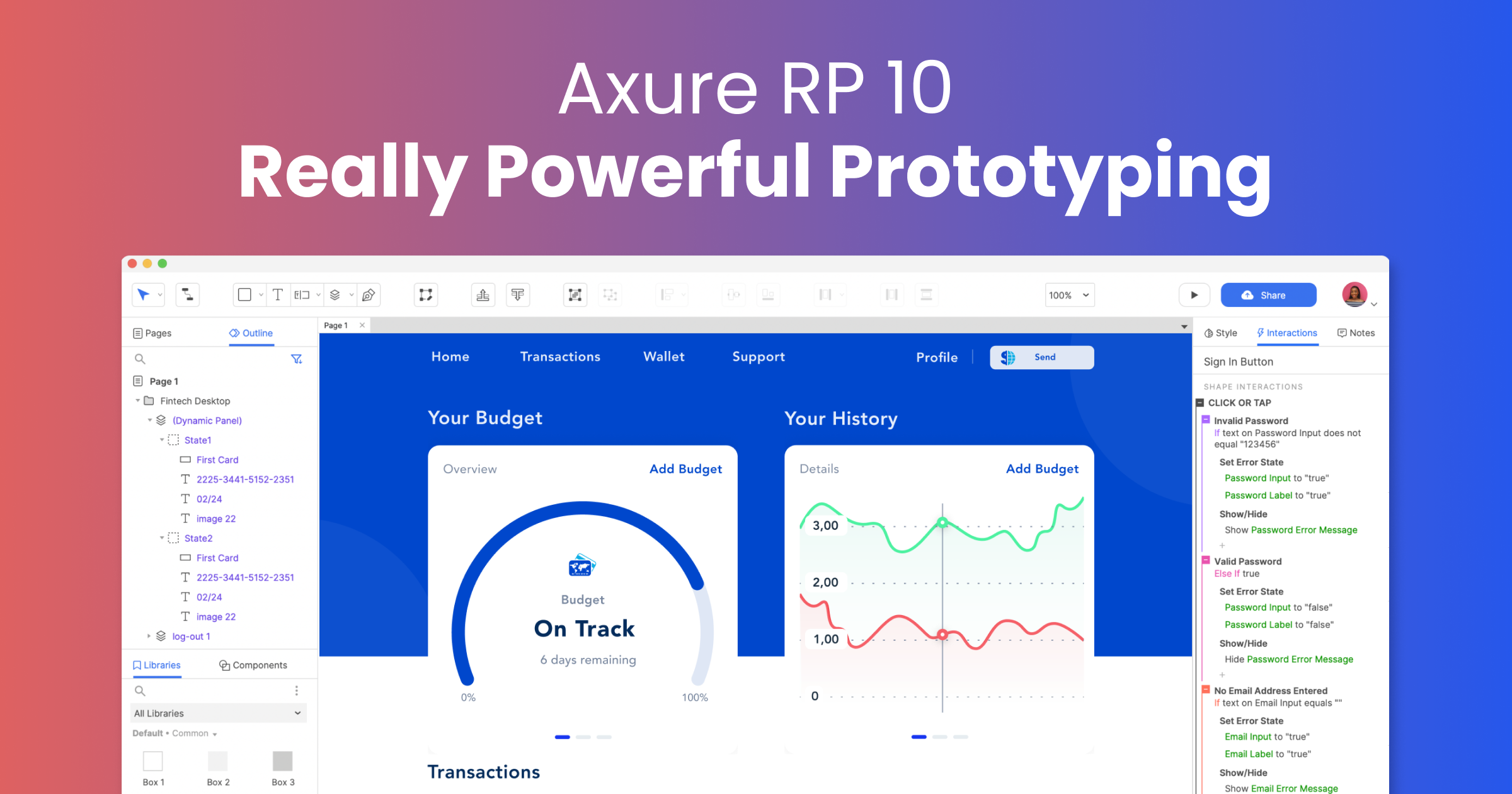 Interactions and Animations: ด้วย Axure RP นักออกแบบสามารถกำหนดการโต้ตอบและภาพเคลื่อนไหวเพื่อจำลองการกระทำของผู้ใช้และการเปลี่ยนระหว่างหน้าจอ รองรับพฤติกรรมการโต้ตอบที่หลากหลาย เช่น ปุ่มที่คลิกได้ การตรวจสอบการป้อนข้อมูลในแบบฟอร์ม เมนูแบบเลื่อนลง แผงสไลด์เข้า และอื่นๆ