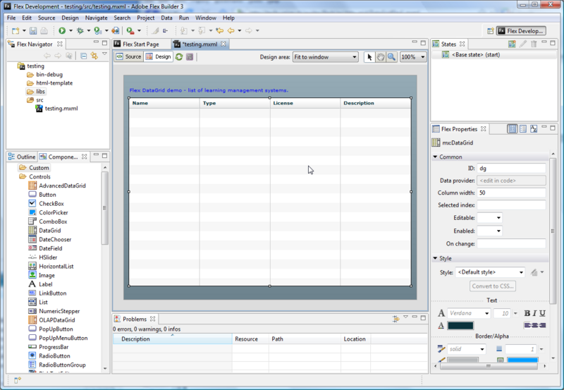 Integrated Development Environment: Adobe Flex Builder ซึ่งเป็น IDE สำหรับการพัฒนา Flex มีโปรแกรมแก้ไขเลย์เอาต์แบบภาพ โปรแกรมแก้ไขโค้ด เครื่องมือแก้ไขข้อบกพร่อง และฟีเจอร์การจัดการโครงการ ทำให้กระบวนการพัฒนาและทดสอบง่ายขึ้น นำเสนอเวิร์กโฟลว์ที่คล่องตัว